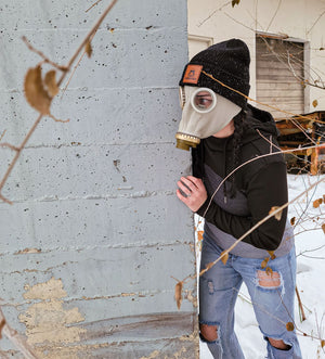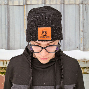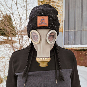 Behold, our first serious head-warmer for the apocalypse! This comfortable, warm beanie comes in black with white speckles like the ash from a super-volcano, adorned with a brown Doomsday Discs patch on the front.
