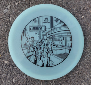 The Area 51 is an approach putter with a shallow profile and overstable finish so that it can handle significant torque, making it an excellent choice for sidearm throws and confident approach shots. It is being released as part of the Conspiracy Line of discs. The premium plastic with a sparkle finish is durable and somewhat stiff and we're calling it Clandestine (for now) to give this premium blend it's own identity. The disc weight will land in the 170-175 gram range (most often around 172 grams).