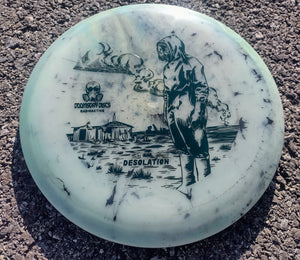 The Desolation is an overstable midrange (though nothing like a Frag) which is comfortable in the hand with a deep enough rim for great grip and release. It will always fade at the end of flight to help navigate around the smashed buildings and burnt-out cars of the not-too-distant future. The weights tend to range on the upper end of 170-176 grams.