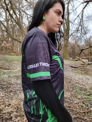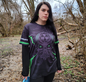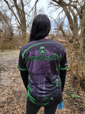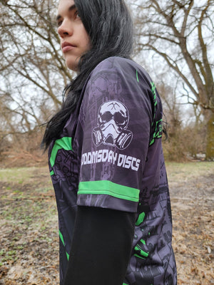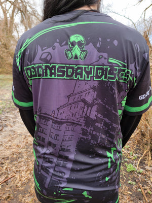This comfortable, quality jersey is available for anybody who wants to spread the name of the Doomsday Discs brand. It features a combination of dark images of crumbling buildings and a gas-masked survivor, highlighted with neon nuclear waste green. It has a logo across the back, a logo on one sleeve, and "Go Down Throwing" on the other sleeve. What's not to like?
