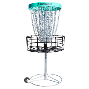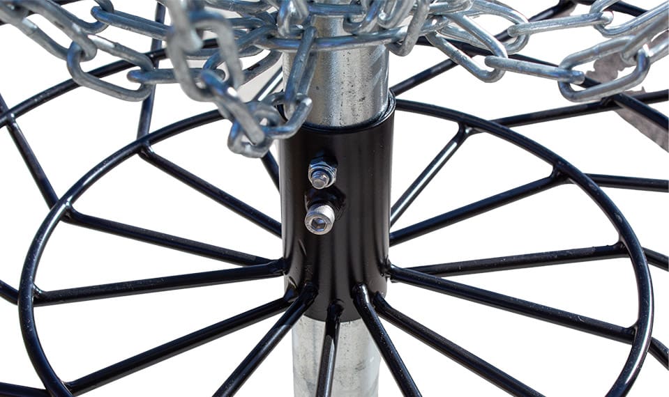 The Heavy Duty basket can come with a portable stand with a wheel to make transportation a breeze, or it can come with a permanent mount pole and ground sleeve if you plan to plant this thing forever. The basket features 3 rows of 12 galvanized chains each, making this a hefty 36-chain death trap for putters. It's painted with a beautiful UV Protected powder coat of black and toxic teal. Tension screws are used throughout the assembly to ensure an earthquake proof level of stability.