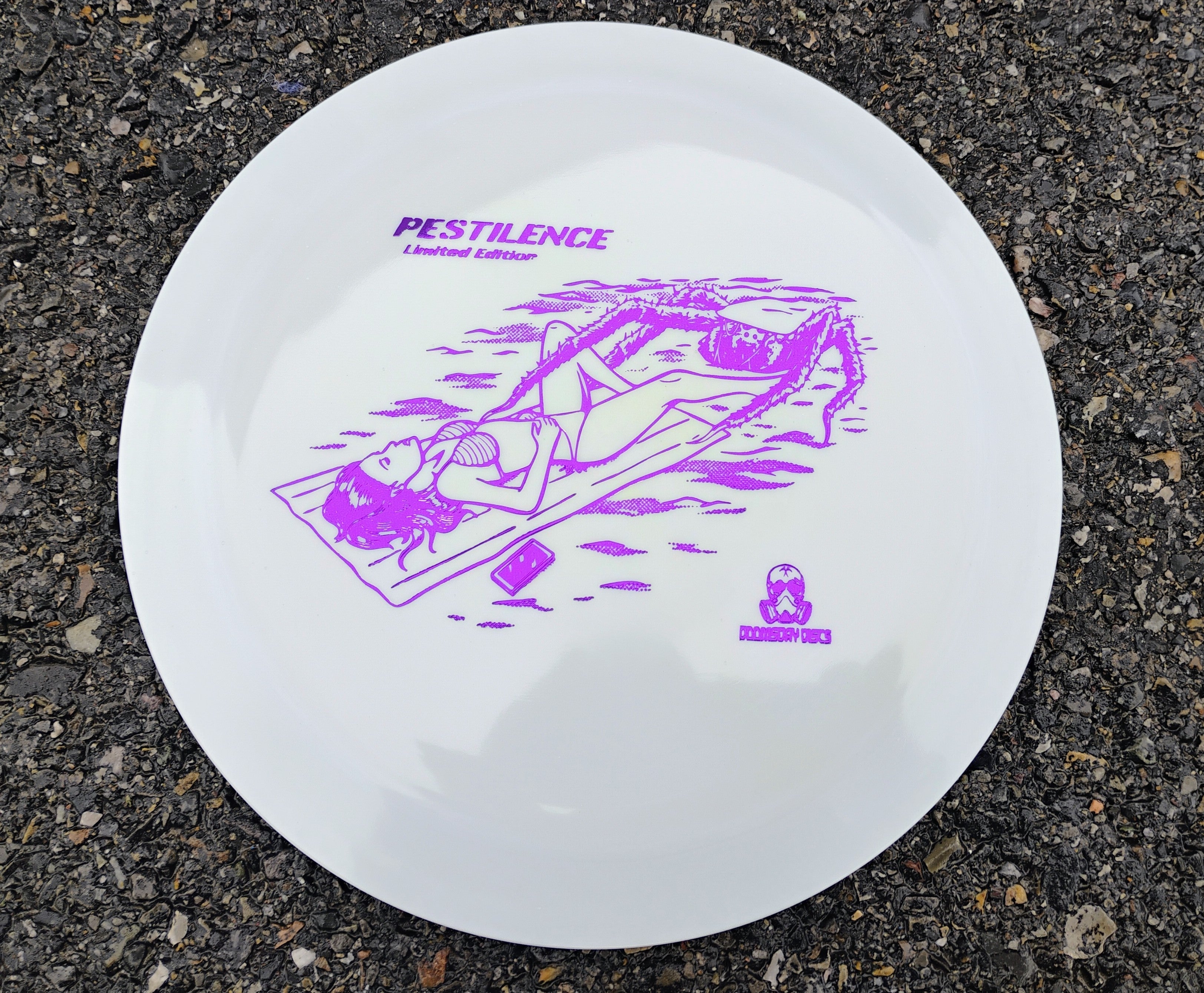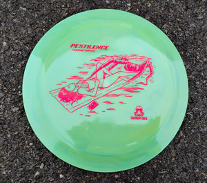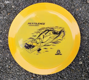The Pestilence is an understable distance driver that should still deliver respectable distances to players with lower arm speeds, despite the wide rim. It is available here in Survival plastic, which is a premium opaque blend without added splatter or effects. The Pestilence will continue to spread across fairways until all are infected.