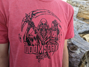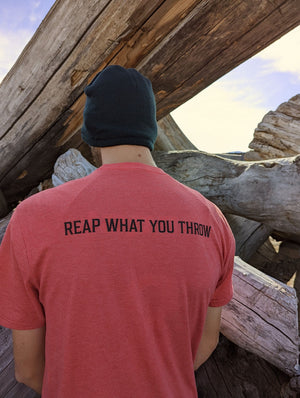 In the interest of apocalyptic awareness on the disc golf course, Doomsday Discs is marginally pleased to introduce the "Reap What You Throw" t-shirt. This red frost District brand T-Shirt is soft and comfortable for both casual wear before and after the end of days. Let other players on the course know that part of the game of disc golf is to reap what you throw. After all, you threw it-- there's nobody else to blame.
