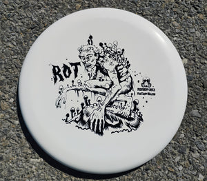 The Rot is a dependable putter with a rounded, beaded rim for comfortable grip, and it comes here in Ration (base) plastic that glows in the dark. Now your rotten putting can even be witnessed at night!