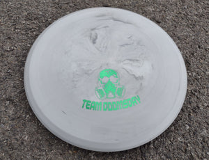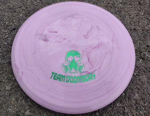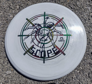 The Scope is a unique approach / midrange crossover disc that has a unique rim configuration. It was 3D modelled by Team Doomsday member Most Average Joey. At first glance, a player might think the rim looks bizarre, but once in the hand and thrown either backhand or forehand, it feels smooth on release and flies great. The Scope holds a straight line with a slight fade to finish, making disc placement easy. It provides more distance than the Land Mine or Depth Charge, making it a useful tool in the Doomsday bag.